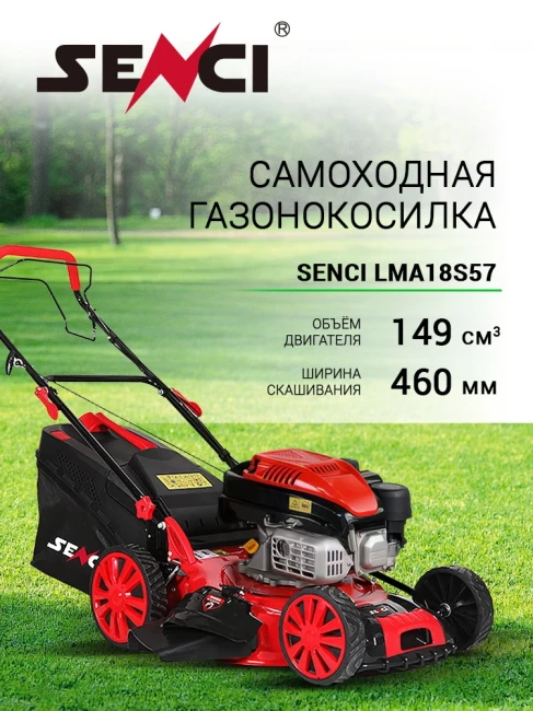 Самоходная бензиновая роторная 4-х тактная газонокосилка Senci LMA18S57. Надежная, мощная, легкая в управлении газонокосилка.