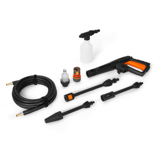 Полный комплект для работы из коробки. Помимо моющей насадки Home&Car Jet, в комплект поставки входит все необходимое: мягкий шланг высокого давления длиной 6м, грязевая фреза, пеногенератор, фильтр тонкой очистки, коннектор для садового шланга DWC 2500 с функцией аквастоп.