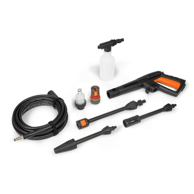 Полный комплект для работы из коробки. Помимо моющей насадки Home&Car Jet, в комплект поставки входит все необходимое: мягкий шланг высокого давления длиной 6м, грязевая фреза, пеногенератор, фильтр тонкой очистки, коннектор для садового шланга DWC 2500 с функцией аквастоп.