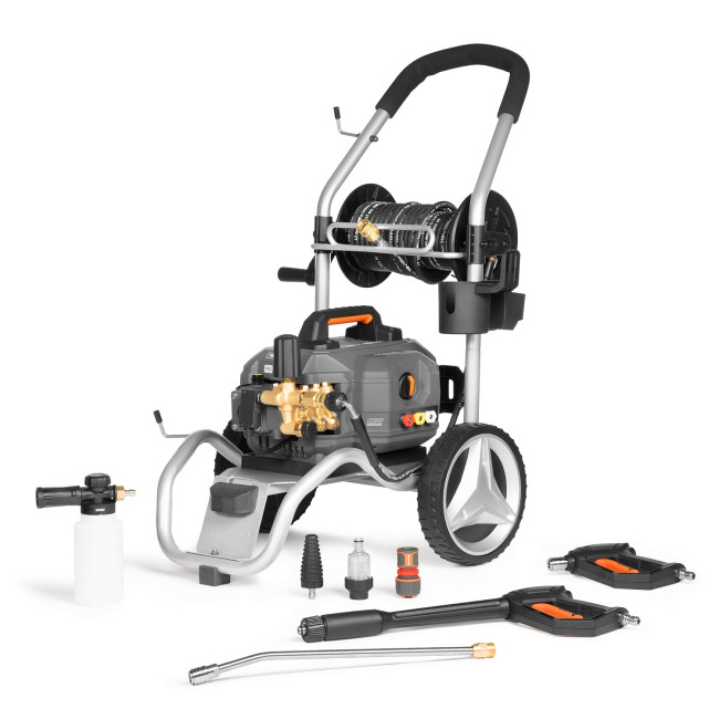 Барабан для шланга. Позволяет аккуратно хранить 12 метров шланга. Облегчает процесс размотки шланга до необходимой длины. Шланг высокого давления аккуратно сматывается на барабан, благодаря направляющей.