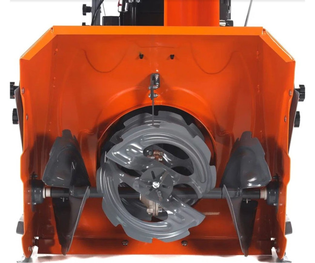 Ширина захвата составляет 610 мм, а высота очищаемого слоя — 585 мм, что позволяет быстро обрабатывать большие площади. Оснащенный трехступенчатой шнековой системой, аппарат не просто сгребает, а эффективно измельчает и перемалывает даже слежавшиеся сугробы и снег с ледяной коркой. Первая ступень (центральный шнек) подбирает и подает снег, вторая (зубья ротора) его дробит, а третья (крыльчатка) выбрасывает через металлическую трубу выброса. Дальность выброса снега достигает 14 метров, что позволяет откидывать массы далеко в сторону, не загромождая проделанный путь. Направление выброса регулируется с удобной панели оператора, а дальность — вручную, обеспечивая точный контроль над процессом.